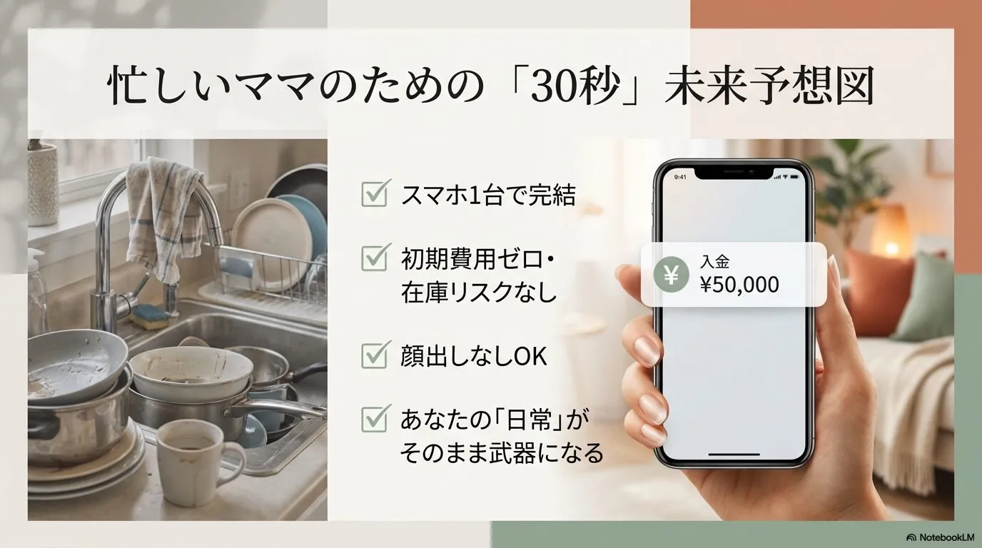 初心者でもスマホ1台あれば初期費用ゼロで安全に始められるだけでなく、日常の家事や育児の経験がそのまま価値あるコンテンツになるんです。