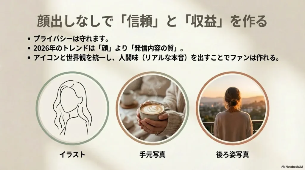 - 顔出しなしOK:2026年最新の戦略なら、匿名でも信頼と収益は作れる。