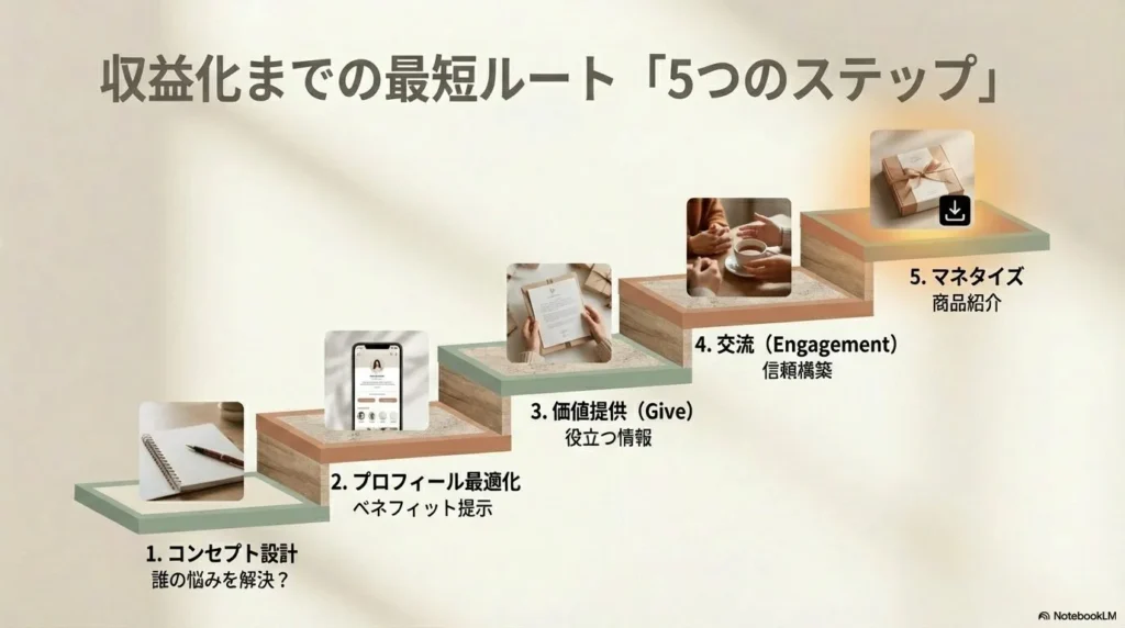 私が実践し、多くのママが成果を出している「最短距離で収益化するための5ステップ」を、さらに具体的に深掘りしてお伝えします。この流れは、まさにSNSという海で迷わないための「航海図」のようなものです。