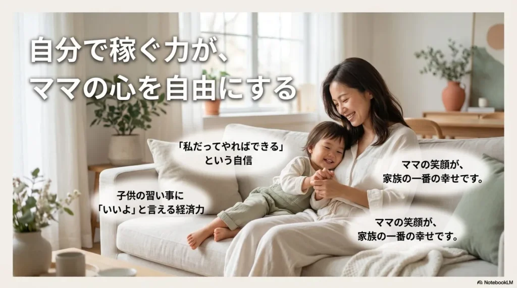 「一人じゃない」という安心感は、メンタルが揺れやすいママの運用にとって最大の救いになります。子供の夜泣きで全然作業が進まなかった日も、生活に寄り添ったアドバイスをくれる。この温かさがあるからこそ、私のような普通の主婦が挫折せずに走り抜けられたんです。