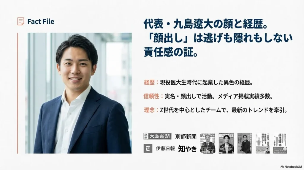 次に、会社の舵取り役である代表取締役社長、「九島遼大(くしま りょうた)」さんという方についても触れておきますね。