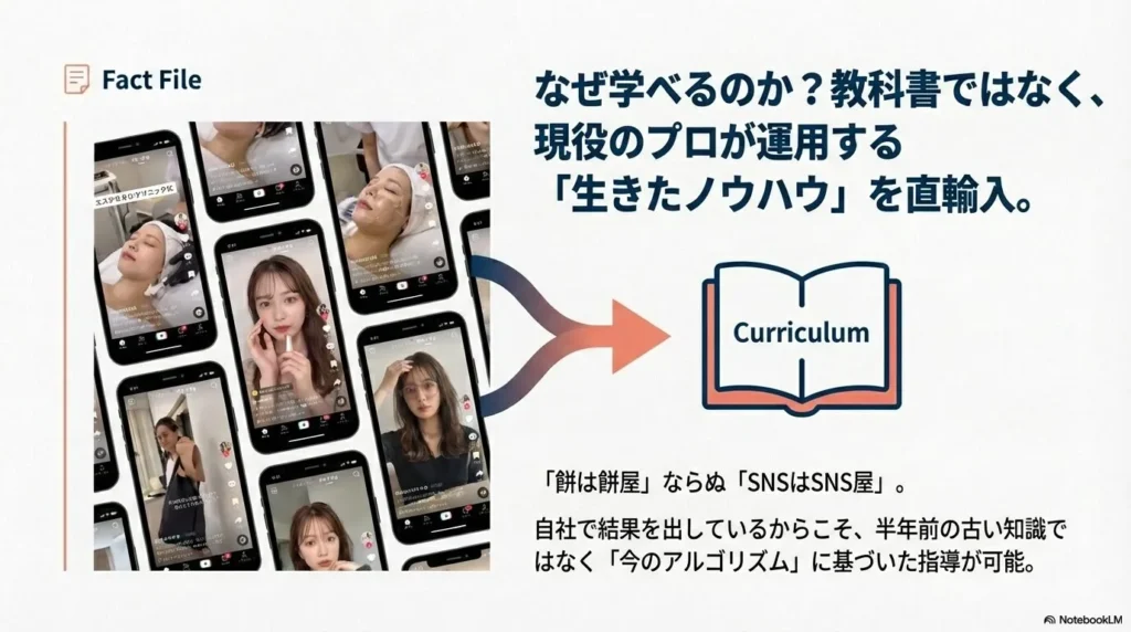だからこそ、教科書だけの古い知識ではなく、「今、現場で何が流行っているか」「どうすれば今のアルゴリズムでフォロワーが増えるか」という最新情報を常に持っている会社が運営しているというのは、ものすごい安心材料なんですよね。