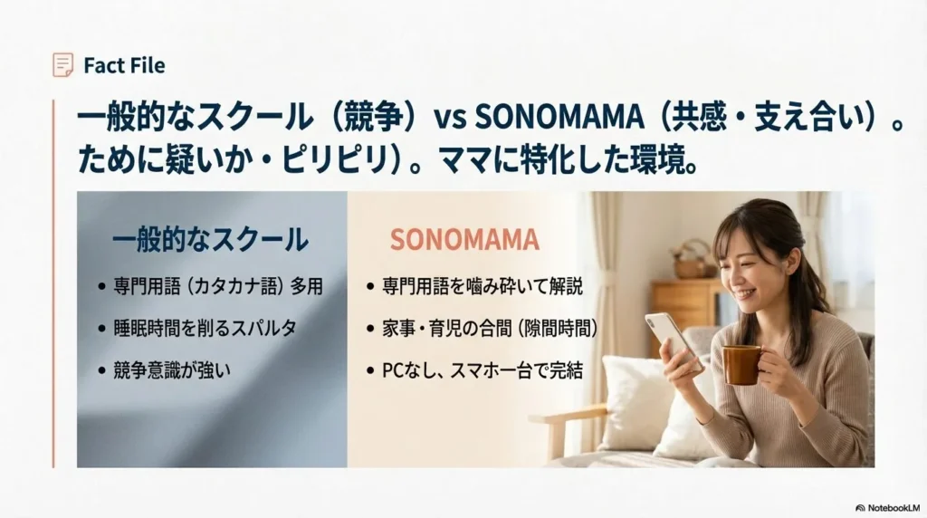 - ✅ ママ特化: 初心者や忙しい主婦に寄り添った優しく手厚いサポート。