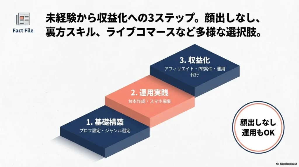 | ①基礎構築期 | SNSの仕組み、プロフィールの設定、ジャンル選定 | まずは「見られる」土台を作る |