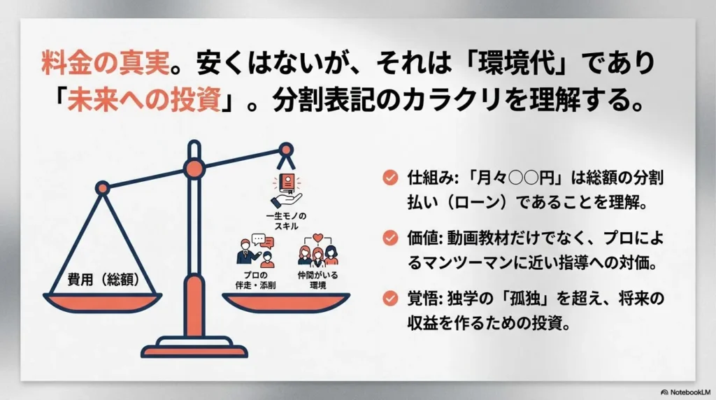 - ✅ 要覚悟: 費用は安くないが、本気で人生を変えたい人への投資価値はある。