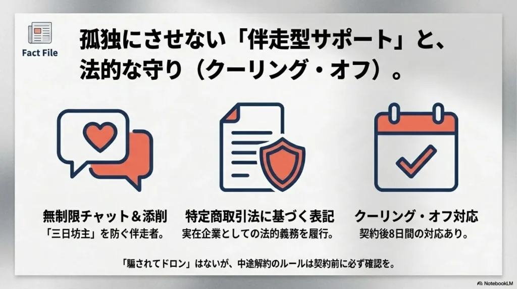 SONOMAMAのようなスクール契約も、特定商取引法の対象となる場合が多いため、基本的にはこの制度が適用されます。