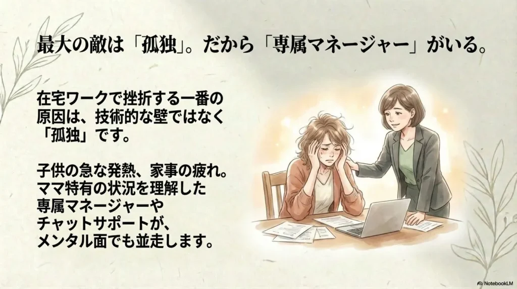 専属マネージャーは、単なる「講師」ではなく、あなたの状況を理解した上で併走する「パートナー」です。「子供が体調を崩して思うように進まない」といった相談に対しても、ママのリアルな状況を考慮した上でのアドバイスが期待できます。(※サポートの詳細はプランにより異なります)