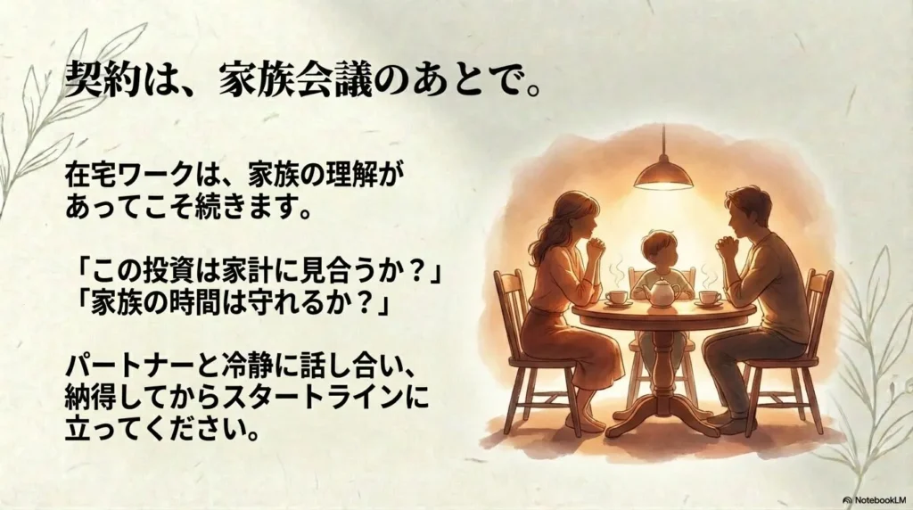 「入れば稼げる」という安易な期待ではなく、「この金額を払って、いつまでに月5万円を達成する覚悟があるか」を自問自答してください。納得できない場合は、その場で契約せず、一度持ち帰って家族と冷静に話し合う時間を設けることを強く推奨します。
