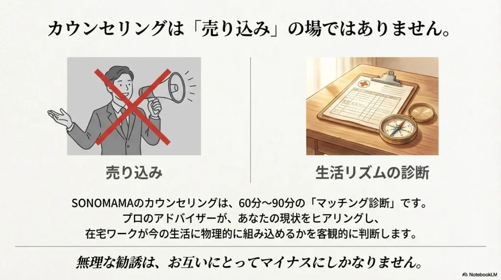 「無料相談に行くと、断れなくなるのでは……」という不安を抱くのは当然のことです。特に家計を預かる身としては、大きな契約には慎重になりますよね。SONOMAMAが公式に掲げている方針と、実際のカウンセリングでの対応について、中立的に整理します。
