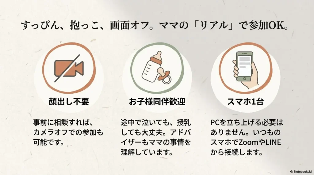 体験者のレポートによると、アドバイザーの方はママの生活に理解があり、リラックスした雰囲気で進められることが多いようです。「抱っこしながらの受講や、画面オフでの参加についても、事前に相談すれば柔軟に対応してもらえる」という声が寄せられています。ただし、公式に「常に自由」と定められているわけではないため、予約時に一言添えておくと安心ですね。