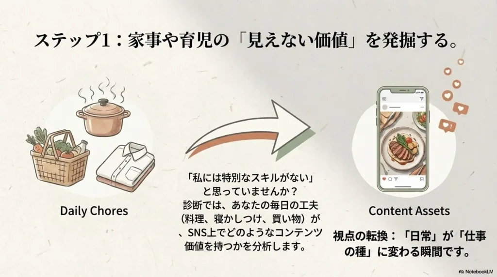 診断では、あなたが無意識に行っている家事や育児の工夫、趣味の知識などをヒアリングし、それらがSNSコンテンツとしてどのように機能するかを分析します。「ママとしての経験」は確かに独自の強みになりますが、それが即座に収益を約束するものではない点に注意が必要です。