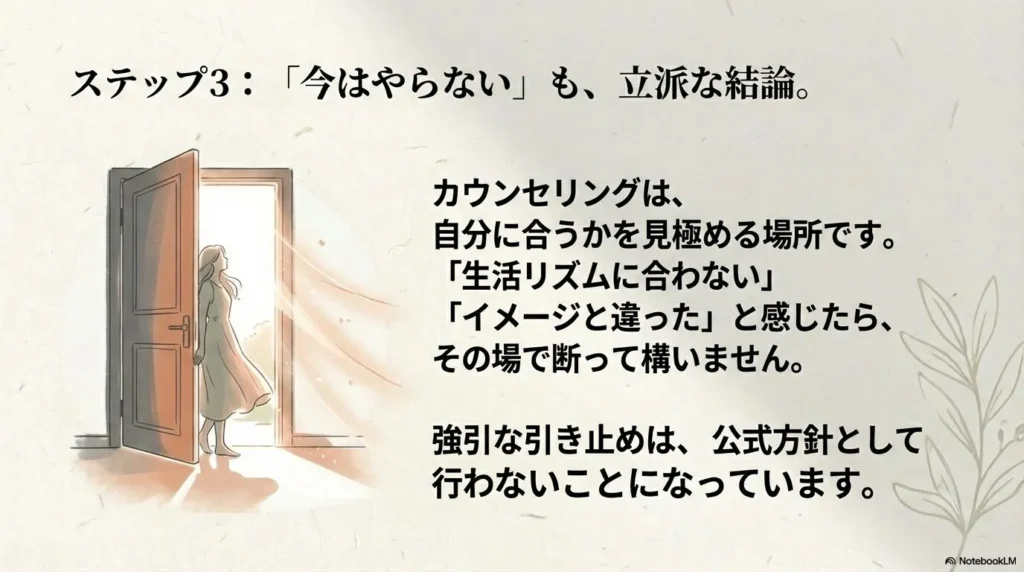 - ✅ カウンセリングは「成果を出せるかどうか」の適性を見極める場