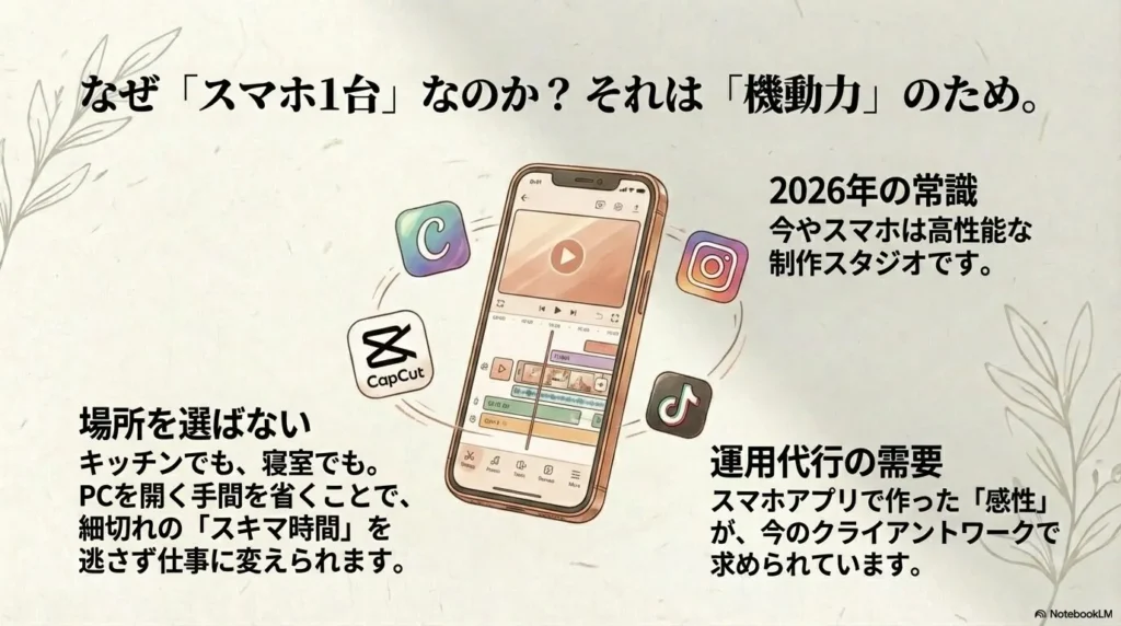 現在、企業や個人事業主の間で、InstagramやTikTokの「運用代行」の需要が高まっています。投稿画像の作成、コメント返信、リール動画の編集などは、実はスマホアプリ(CanvaやCapCutなど)の方が直感的でセンス良く仕上がることも多いのです。