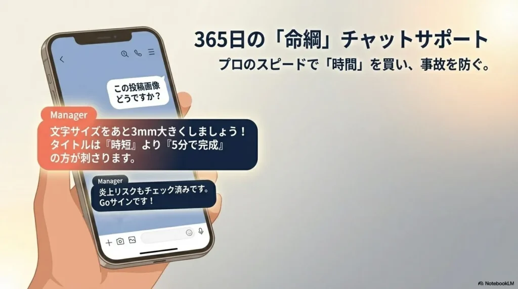 - 🚩 プロの眼差し: 投稿前に「事故(炎上や規約違反)」を防げる。
