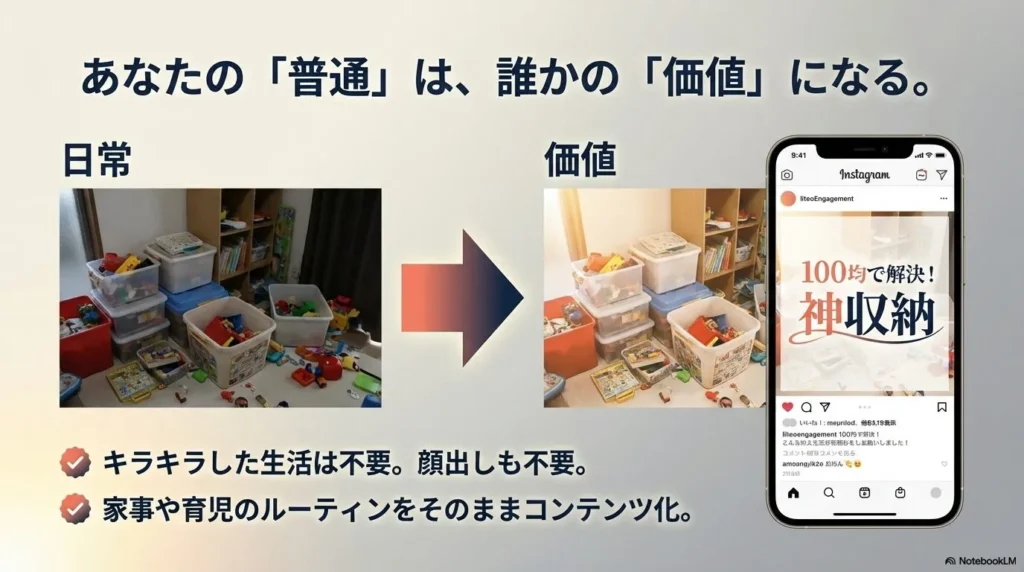 独学でSNSを始めると、多くの人が「有名インフルエンサーの真似」をして失敗します。高級ランチやブランド品を載せようとして、家計が苦しくなり、心も折れてしまう…。でも、SONOMAMAのマンツーマンサポートでは、マネージャーがあなたの生活を丁寧にヒアリングし、あなたの今の生活そのものを「コンテンツ」として磨き上げてくれます。例えば、毎日の夕食作りを「15分で終わる時短レシピ」として発信したり、散らかりがちな子供部屋を「100均グッズだけで整える収納術」としてまとめたり。自分にとっては当たり前の日常が、実は多くの主婦にとって「喉から手が出るほど知りたい情報」に変わるんです。この「自分だけの勝てる場所(ポジション)」を見つける作業を、プロが一緒に行ってくれるのが最大の強みです。