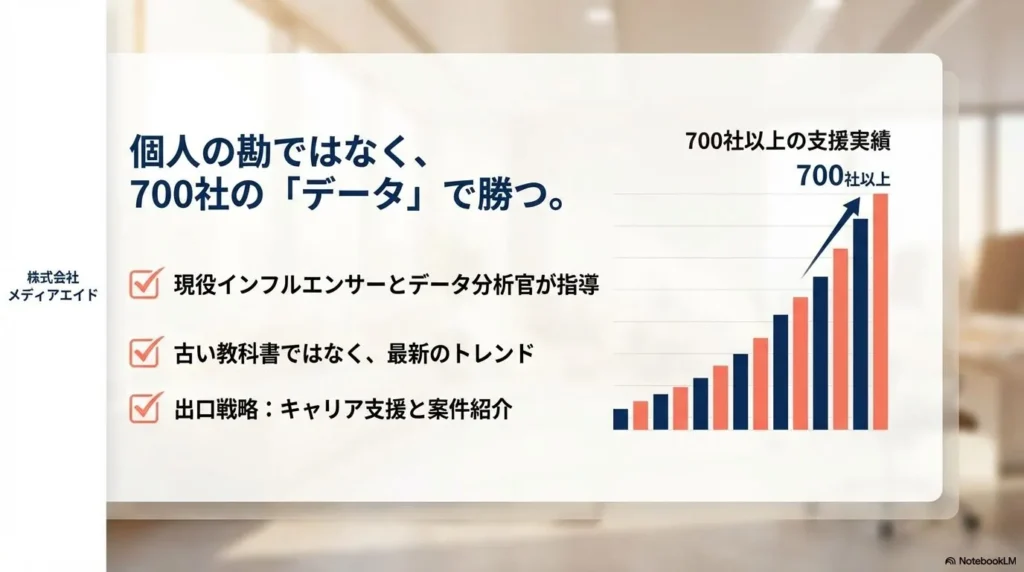 世の中には他にもたくさんのSNSスクールがありますが、SONOMAMAが唯一無二なのは「運営会社メディアエイドの圧倒的実績」に裏打ちされている点です。SNS運用代行で700社以上の企業を支えてきたプロ集団がバックにいるスクールは、他にありません。個人が趣味の延長でやっているコンサルとは、データの深さも情報のアップデート速度も、文字通り「桁違い」です。