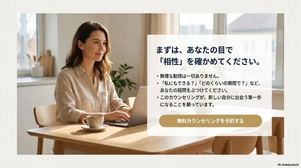 「興味はあるけど、騙されるのが怖い」というあなたに、最後のアドバイスです。SONOMAMAが詐欺かどうか、あなたに合っているかどうかを判断する唯一の方法は、無料カウンセリングを「あなたがスクールを面接する場」として活用することです。