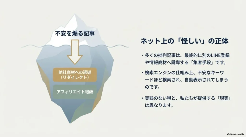 - ●「怪しい」と言われる原因の多くは、ネット上のアフィリエイト記事や検索アルゴリズムの仕組みにあること