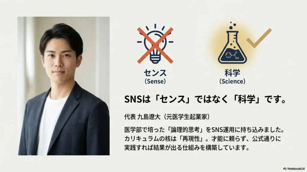 九島さんは、現役の医大生時代にSNSマーケティングで起業したという、非常に珍しいキャリアの持ち主です。医学部で求められる「緻密な分析」と「論理的な思考」を、これまで感覚的だと思われてきたSNS運用の世界に持ち込んだのが、彼の最大の功績なんです。