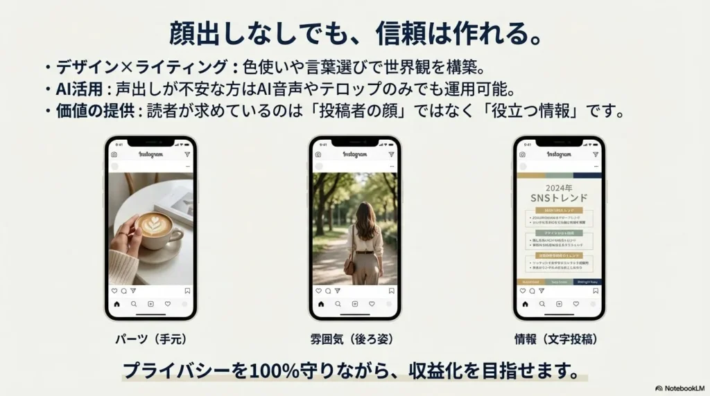 - ✅ 視聴者が求めているのは「有益な情報」であり、顔出しは必須条件ではない