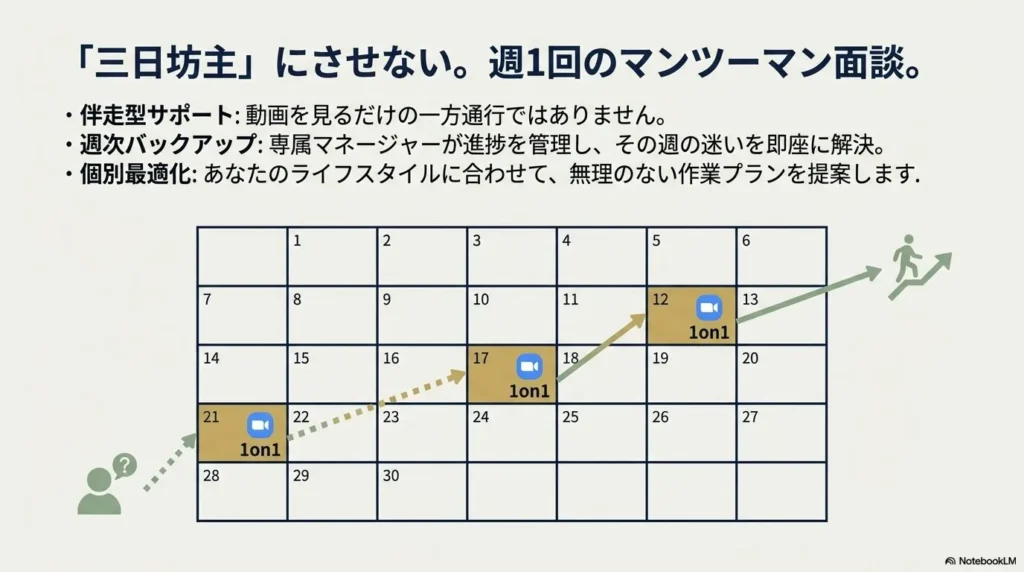 そこを打破するのが、「毎週、あなただけのためにプロの講師が待っている」という約束の力です。SONOMAMAでは、動画を見るだけの一方通行な学習ではなく、専属のマネージャーがあなたの進捗を細かく把握し、毎週の面談で直接フィードバックをくれます。