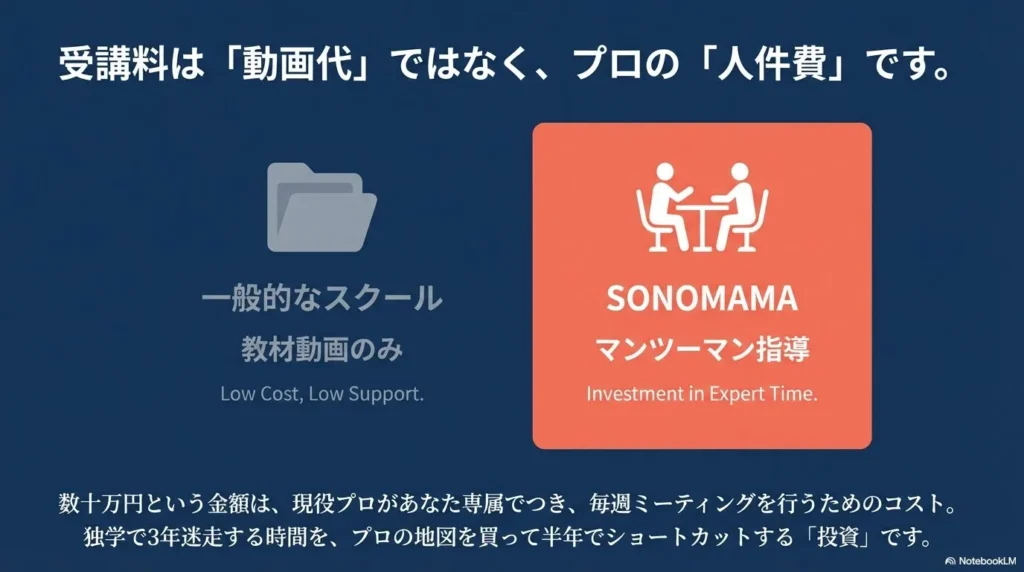 - ✅ 「お金を払って放置」ではなく、具体的なカリキュラムと講師が存在する