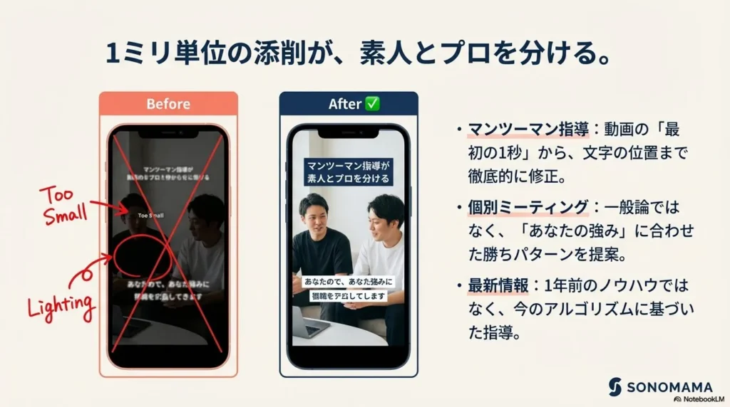 この「組織としてSNSをハックしている」という強みは、個人が副業の延長で教えているスクールとは決定的に違う点です。