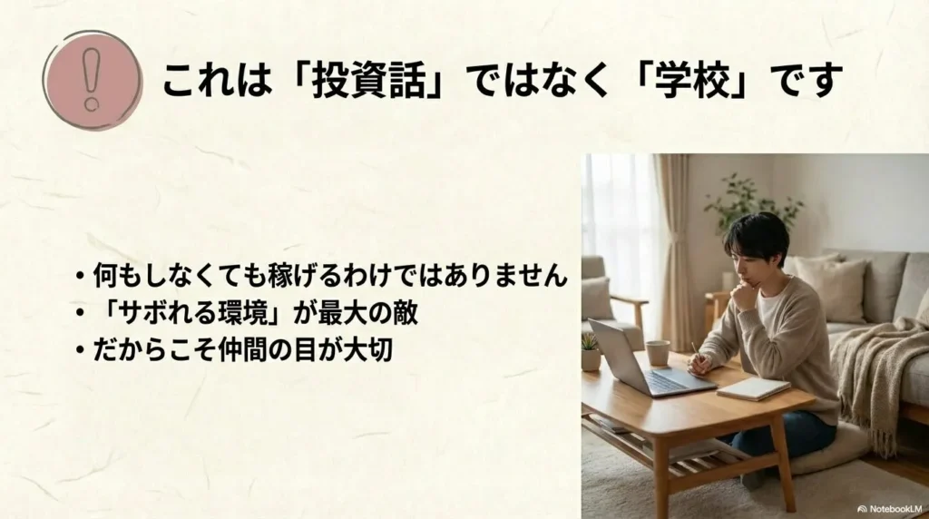 これはどんなスクールでも起こりうることですよね。SONOMAMA スクールは、あくまでスキルを身につける「学校」であって、お金を自動で増やす「投資先」ではありません。この違いを理解しているかどうかが、満足度の分かれ道になります。