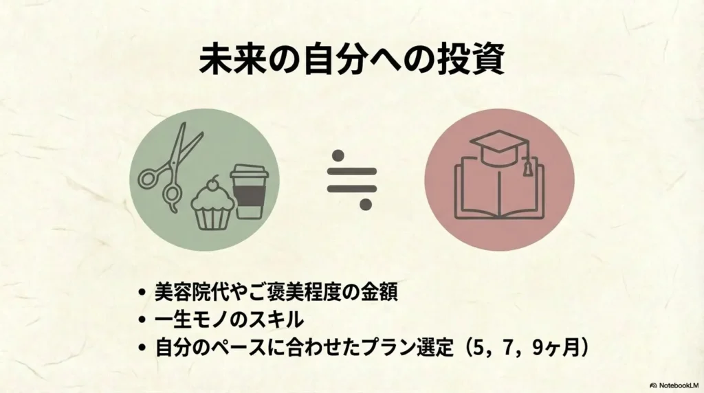 これ、美容院代やちょっとした自分へのご褒美を調整すれば、なんとか捻出できる金額だと思いませんか?私は「このお金をただの出費にするか、未来の自分からの投資にするか」という視点で考えました。もし、スクールでしっかり学んで月5万円稼げるようになれば、たった数ヶ月で受講費用の元は取れてしまうんです。