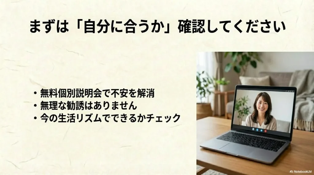 • リスク: 怪しい噂は誤解。無料説明会で自分に合うか確認することから始めよう