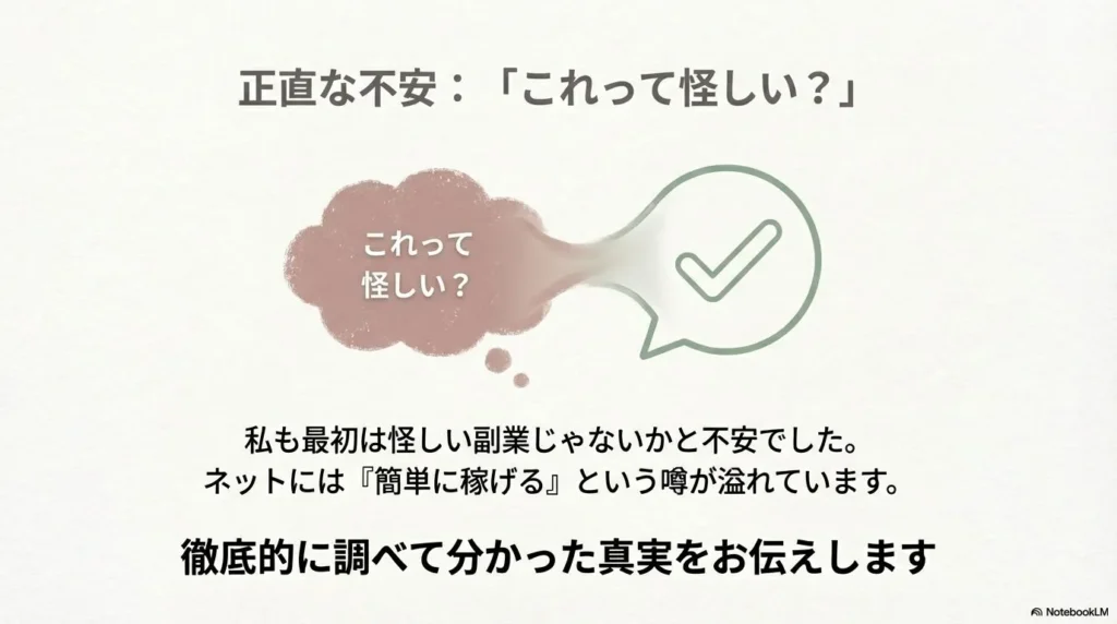 実は私も、2人の子供を育てる中で社会から取り残されたような孤独感を感じて、SONOMAMA スクールが気になっていた一人なんです。怪しい副業じゃないかな、高い費用を払って損しないかなって不安でいっぱいでした。そこで、私自身が徹底的に調べて、実際に一歩踏み出してみた結果、今ではスキマ時間だけで自分の収入を得られるようになりました。この記事では、私が分かったことの全てをお伝えしますね。