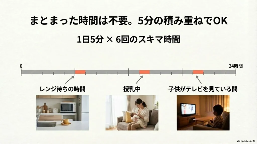 無理に睡眠時間を削らなくても、生活の合間で進められるのが魅力です。私はよく、スーパーのレジ待ちや、子供の習い事の待ち時間にも動画をチェックしていました。この「スキマ時間の有効活用」が身に付くと、人生の密度がグッと上がった気がします。