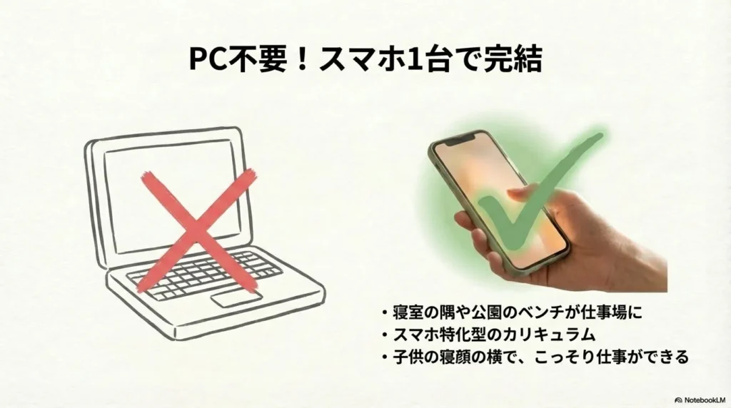 • 再現性: PC不要!スマホ1台・スキマ時間で「月5万」を目指すママ特化型カリキュラム